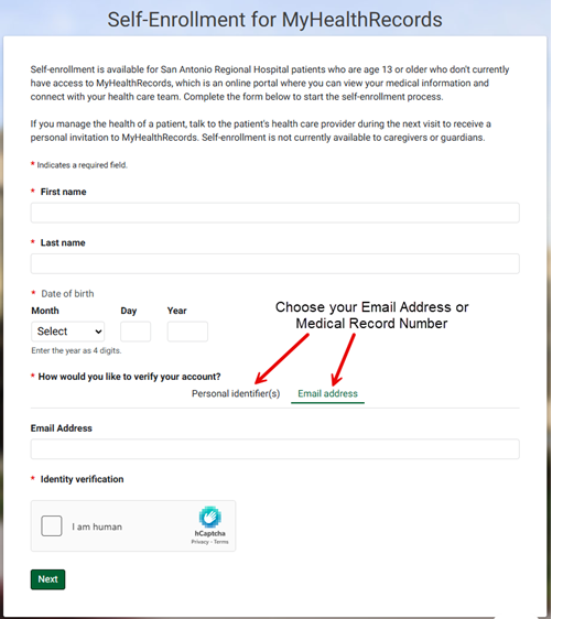 When registering for a San Antonio Regional Hospital service, a registration representative can send you an invitation to your personal email address to pre-enroll you. Follow the instructions in the email to create your My Health Records account.